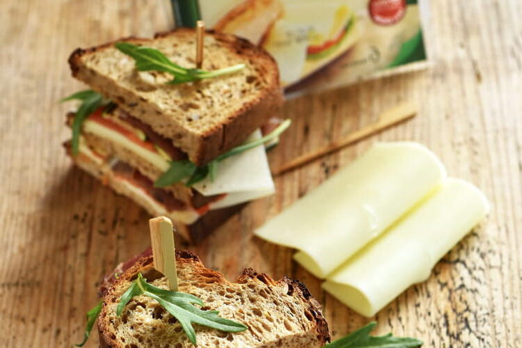 Club Sandwich with sheep cheese, grilled vegetables, and country ham