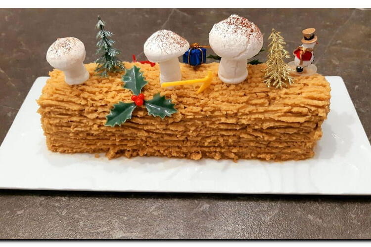 Here is a lovely coffee yule log for the holiday season, decorated with little meringue mushrooms, a true delight and homemade.