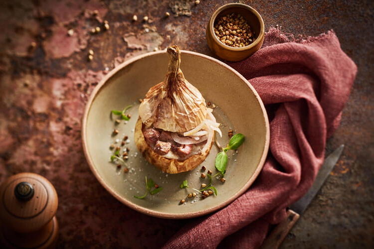 Remove the garlic from the oven, open the foil, and let it cool for a moment. Squeeze the cloves to collect the pulp in a bowl by mashing it with a fork. Mix in a tablespoon of oil and a tablespoon of chopped chives. Set aside.