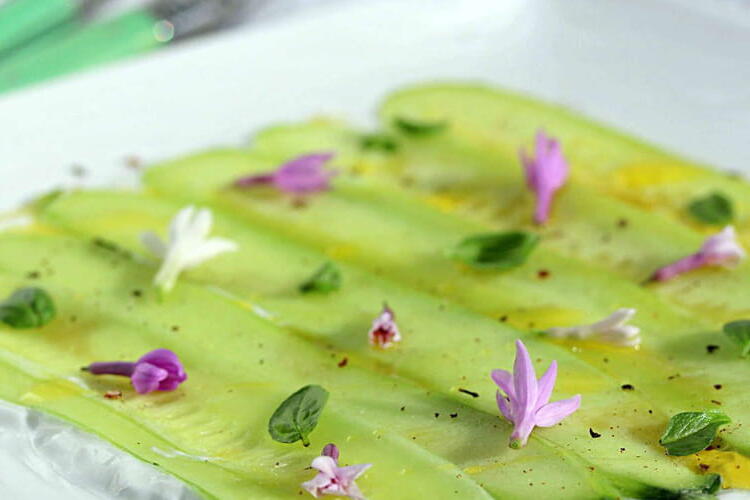 Arrange the thin slices of cucumber on each plate. Sprinkle the carpaccio with finely chopped fresh mint and edible flowers with a hint of garlic. Drizzle with a small amount of canola oil and finish with a twist of the pepper mill.