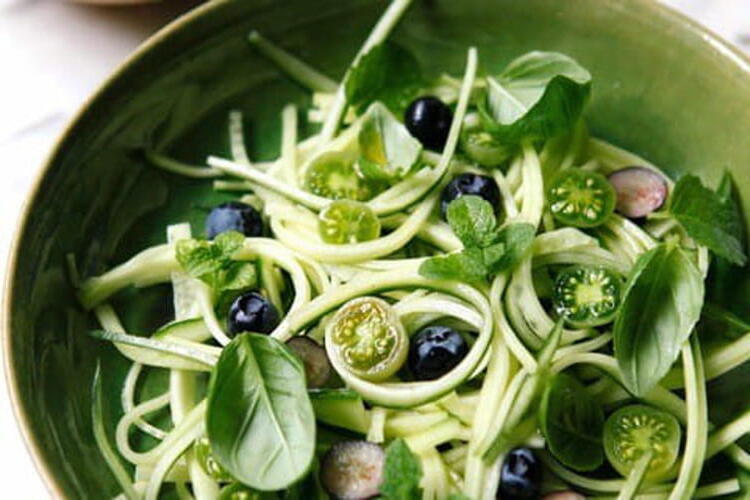 To finish, wash the cherry tomatoes, cucumber, and blueberries. Spiralize the cucumber or cut it into very thin slices with a knife. Cut the cherry tomatoes and blueberries in half. Place all the ingredients and the sauce in a bowl, then gently mix. Add some mint and basil leaves for decoration.