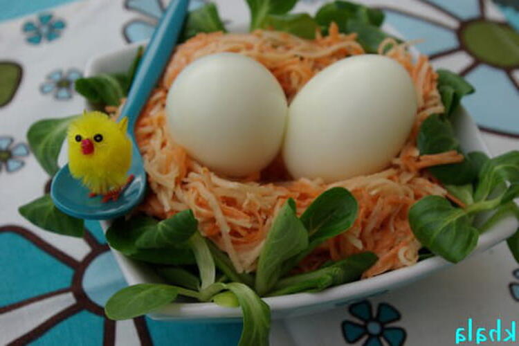 Fill the inside with coleslaw (carrot/sunchoke mixture) shaping it like a nest and gently place the eggs inside.