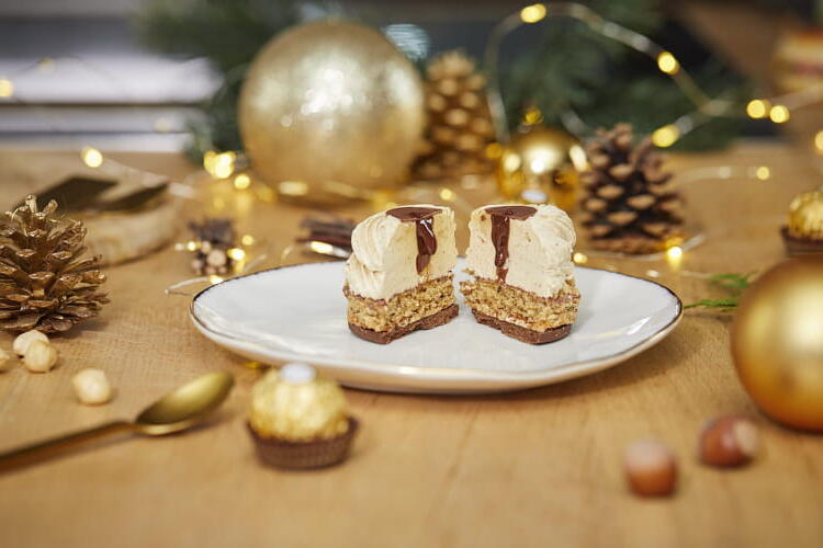 To finish: Stick the disk of sweet pastry to the hazelnut biscuit using a bit of mousseline. Pipe two rosettes of mousseline onto the biscuit. Insert a whole hazelnut and then cover with chocolate sauce. Close with the disk of chocolate attached to the hazelnut candy. Place a sheet of gold on top. Chill for 30 minutes. Enjoy!
