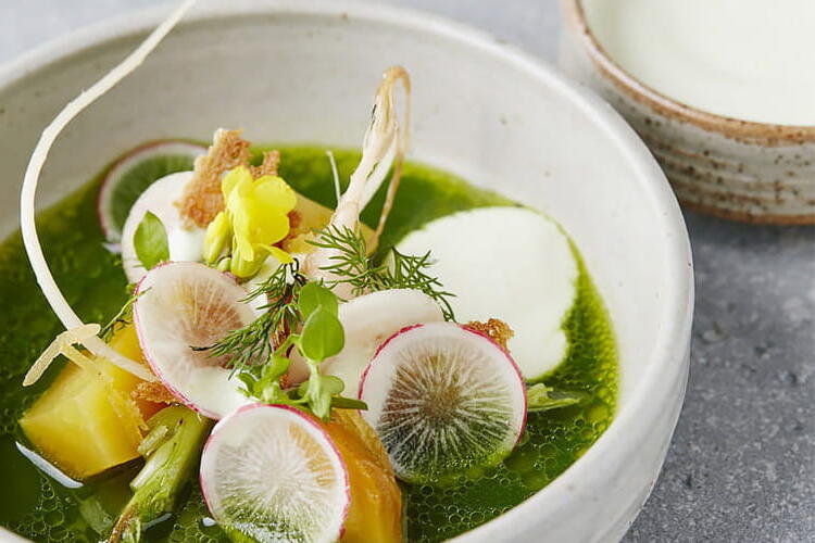 A recipe for a fresh herb broth with yogurt and radishes created by a Belgian star chef. A recipe that is very quick to prepare. Photo credit: Heikki Verdurme.
