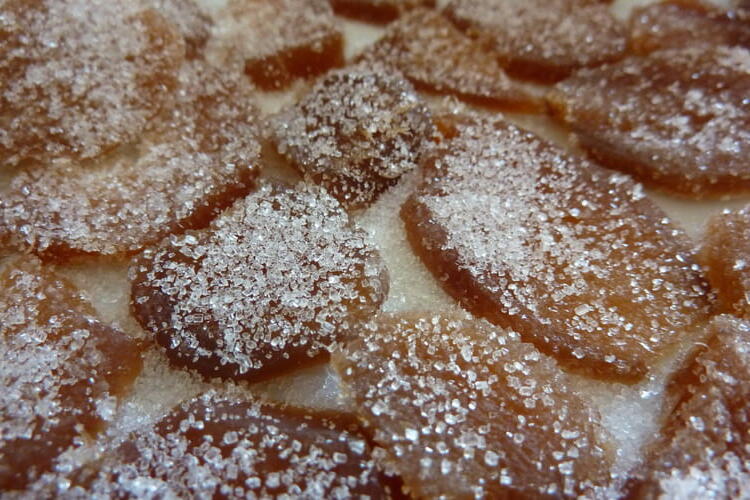 To finish, drain while collecting the syrup. Place the ginger on a rack and let it dry for 24 hours. Coat with granulated sugar and store in an airtight container protected from moisture.