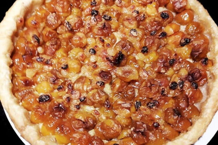 Arrange the halved plums in circles, overlapping them. In a bowl, beat the egg, rum, sugar, and raisins, then spread over the tart.