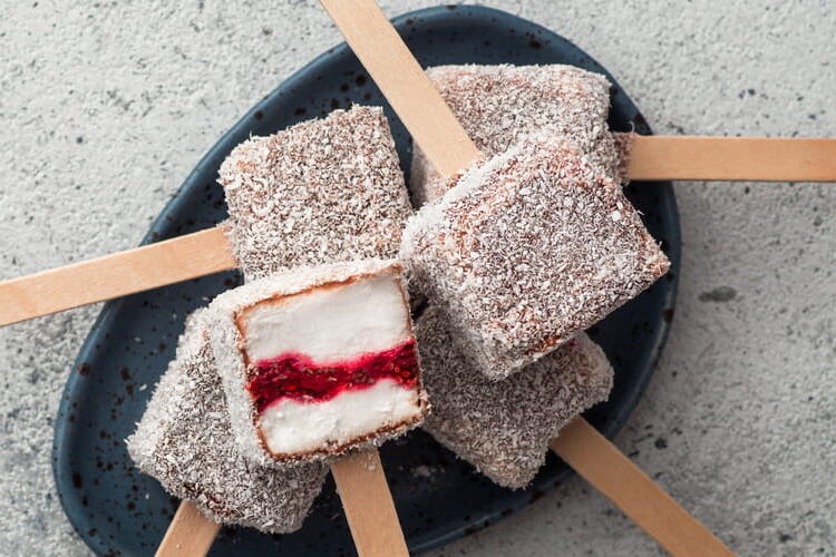 With the help of a stick inserted into each cube, fully dip the cake squares into the hot sauce.