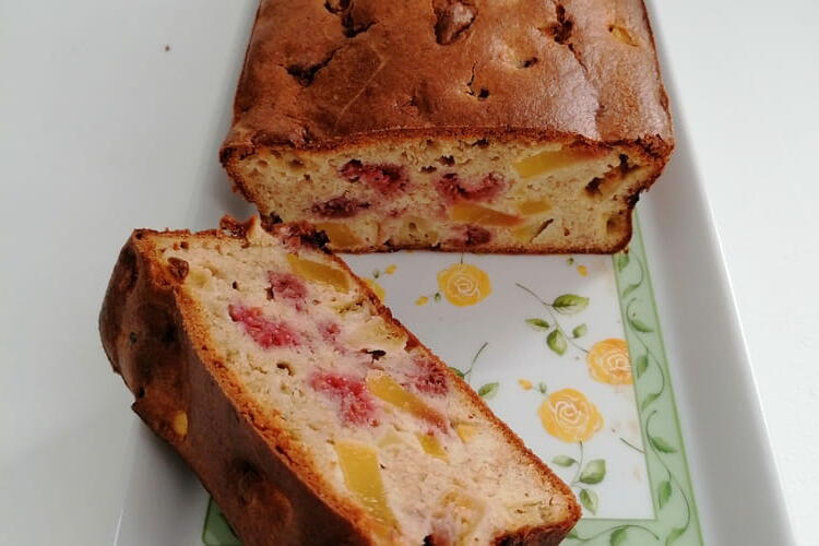 Once the mixture is smooth, add the chopped peaches and the handful of raspberries. Gently mix to avoid damaging the fruits.