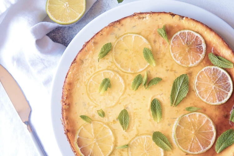 To finish, let the cheesecake cool before unmolding it. At serving time, decorate the cheesecake with thin slices of lime and mint leaves.