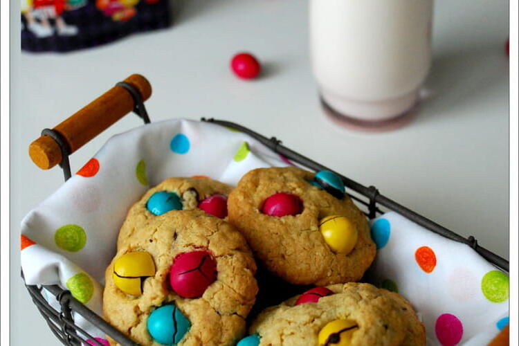 Make balls (not too big as the cooked dough is quite dense) placing them 3 cm apart on a baking sheet lined with parchment paper, then flatten them with the palm of your hand. Add 3 candies per cookie, reshaping the cookies if this step has caused them to spread a bit.