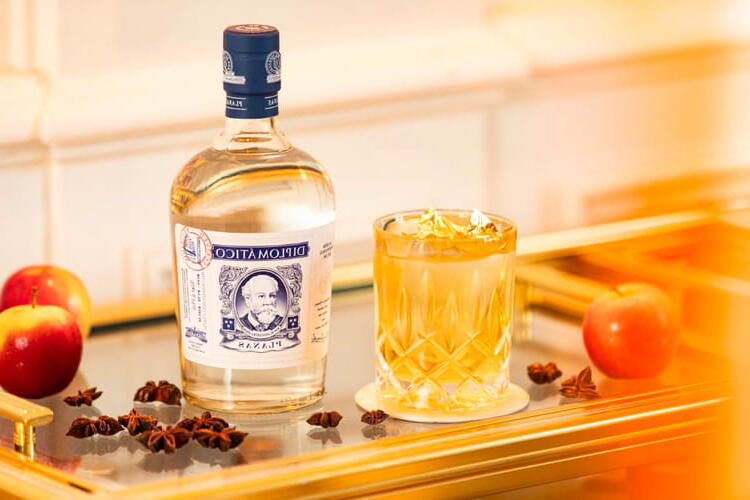 To finish, serve the cocktail over ice with a nice ice cube and gold leaves as decoration.