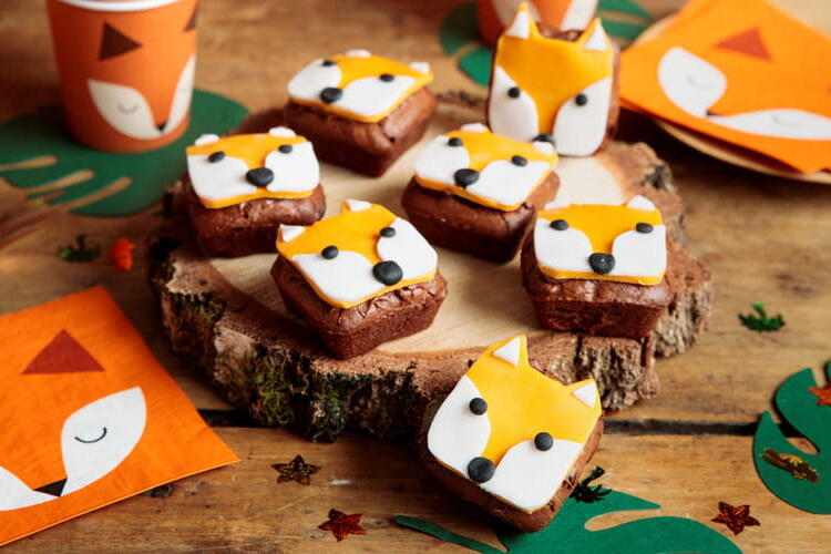 To finish For assembly Spread a bit of spread on the brownies (a thin layer is enough, it allows the fondant to hold). Place a fondant fox head on each brownie.
