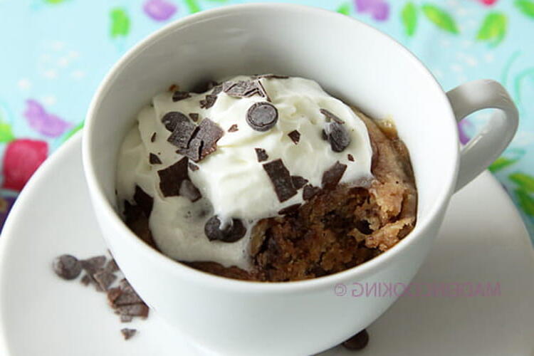 To finish, I added an extra 30 seconds to the cooking time because I don't like it too runny. It turned out great, but you need to eat it right away; otherwise, it hardens. You can accompany this treat with whipped cream like I did, or with vanilla ice cream, or even with custard. I made the recipe in a large tea or coffee mug to minimize overflow.