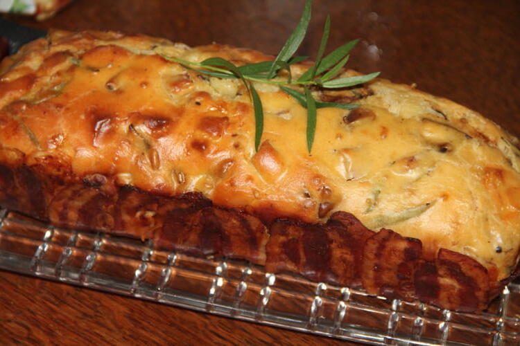 Pour the mixture into the loaf pan lined with slices of smoked bacon without filling it to the edge and bake for 40 to 45 minutes. Check the doneness of the cake with the tip of a knife.
