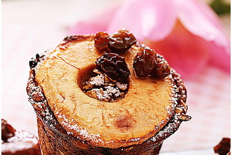 To finish, preheat the oven to 180°C. Add the lightly beaten egg. Add the drained dried fruits and the pieces of figs. Mix all the ingredients well. In silicone muffin molds, distribute the batter to make 6 muffins. On top of each muffin, place a slice of apple and press lightly. Bake in the hot oven for 30 minutes.