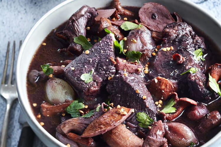 Organic meat inspires winter recipes like this delicious organic beef bourguignon with wild mushrooms and crushed butternut squash with chestnuts.