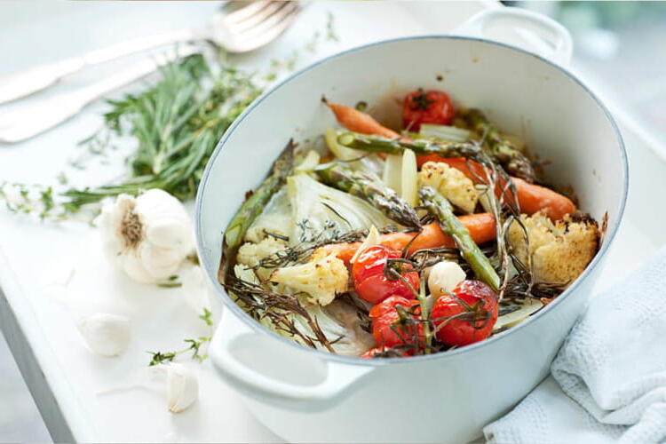 Arrange all the vegetables, along with the fresh herbs, in a covered baking dish. Season with salt and pepper and add the halved garlic cloves. Pour in the fresh cream.