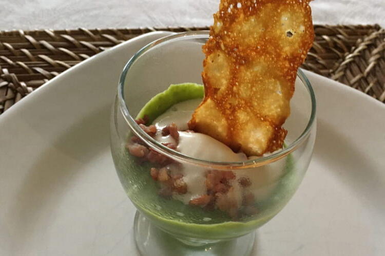 To finish, pour the pea cream into small glasses, put the parmesan mousse using the siphon. Distribute the strips of bacon and place a parmesan crisp on top.