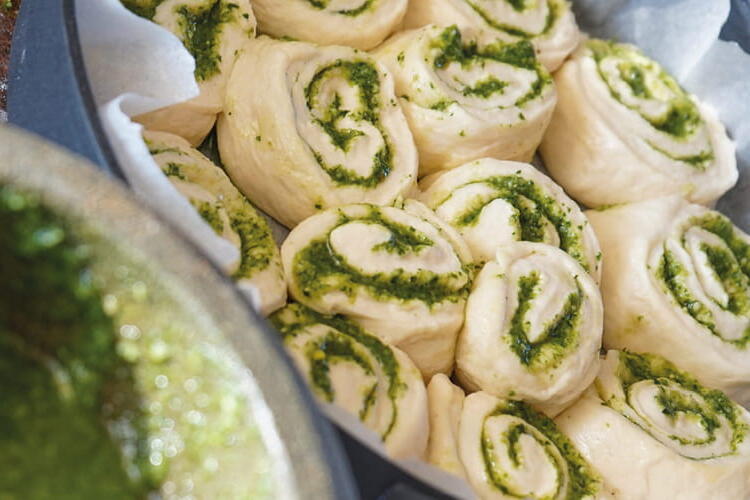 Now roll out the dough into a large slice and spread pesto on it. Roll the dough tightly and cut into slices of 1.5 cm.