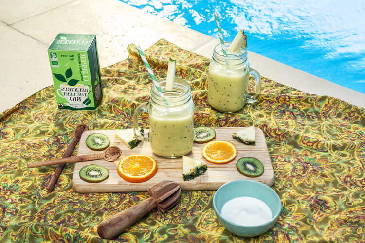Blend the chopped pineapple, kiwi, freshly squeezed orange juice, cooled tea, and desired yogurt that will add texture to the smoothie.
