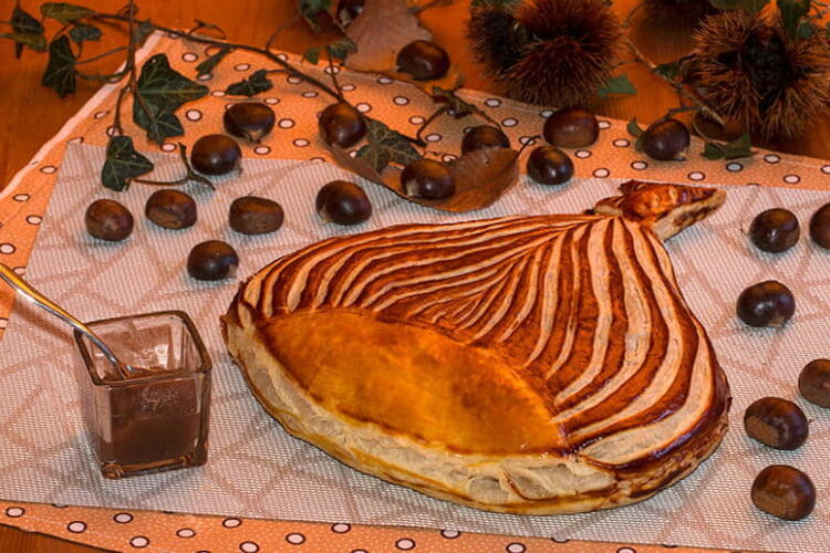 Brush again with egg. Create swirls that follow the shape of the chestnut on the dough with the tip of a knife.