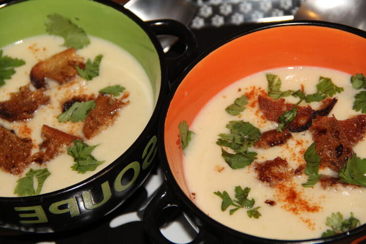 Pour the asparagus cream into large soup bowls. Sprinkle with a little chili, fresh coriander leaves, and a few pieces of croutons. Serve the rest separately.