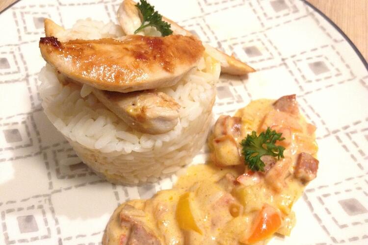 Recipe Chicken Strips with Chorizo Sauce and Vegetable Rice