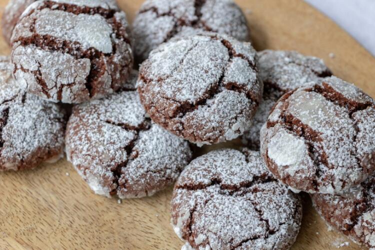Form balls with about a tablespoon of dough. Roll these balls in powdered sugar before placing them on the baking sheet. Slightly flatten them with the palm of your hand.