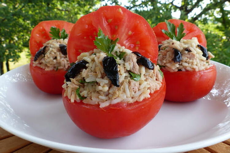 Here is a recipe that had its heyday in the 1960s-1970s, stuffed tomatoes. A very simple and refreshing family appetizer, a kind of rice salad in a tomato shell...