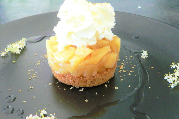 To finish, whip the cream with the powdered sugar until it forms soft peaks. Place a tartlet base on each plate. Add a pastry ring of its size and fill it with apples to three-quarters full. Top with whipped cream, then carefully remove the ring. Sprinkle with grated tonka bean and a little sugar. Add a tablespoon of elderflower syrup around each tartlet.