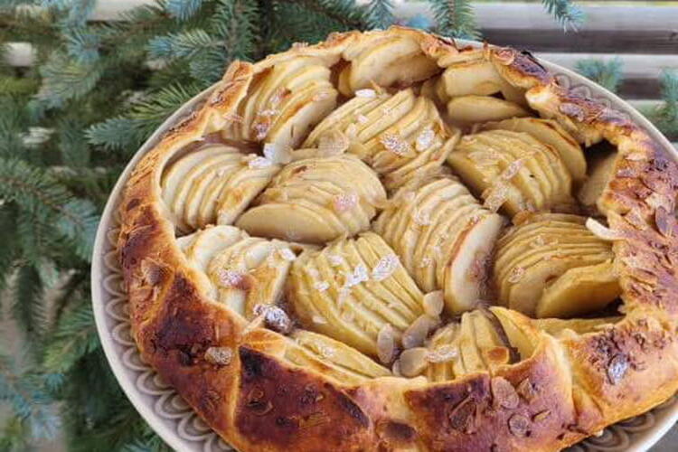 Place the dough (flat) in a large pan or baking sheet, then spread the chestnut jam, leaving about a 3 cm space around the edge of the dough. Arrange the slices of apple on top of the chestnut jam, spreading them out slightly. If it's too complicated, you can arrange them like a classic pie, in a spiral. 😊