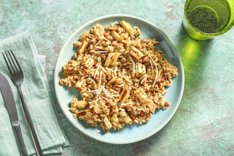 Discover the recipe for asparagus risotto with smoked bacon, AOP parmesan, and sunflower seeds, perfect for an Easter meal. This recipe featuring smoked bacon, risotto rice, parmesan, white asparagus, and sunflower seeds is foolproof and will introduce you to new flavors.