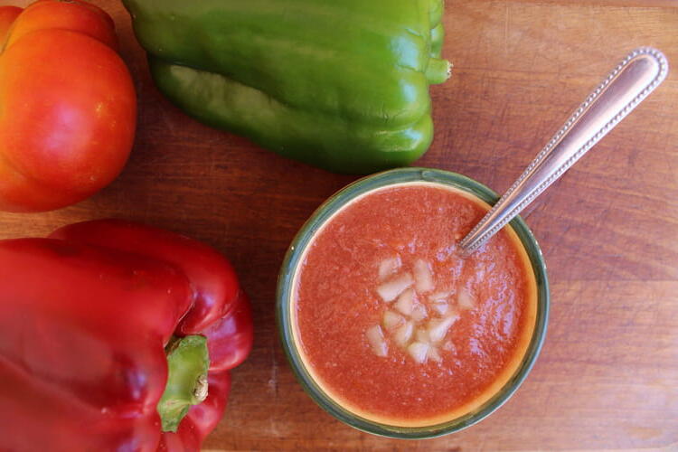 Mixing the ingredients In a bowl, soak the stale bread in vinegar. Wash the vegetables, peel the tomatoes and cucumbers, and optionally the peppers if desired (in the original recipe, the peppers are not peeled, but I find it more pleasant not to have small pieces of pepper skin in the gazpacho!).