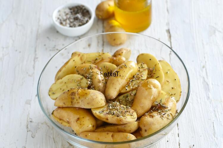 MIX in a bowl the washed potatoes cut in half lengthwise with olive oil and the herbs. Add salt and pepper.