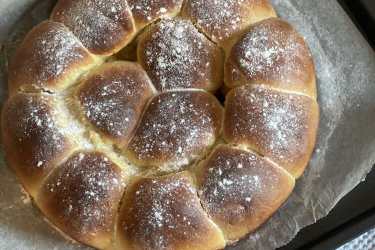 Preheat the oven to 180°C. Degas the dough and transfer it to a floured work surface. Divide into 10 pieces of equal weight, mine were about 72 g each. Shape each piece into a ball and place them on two baking sheets, spacing them well as they will expand.