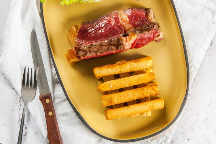 Cook your ribeye differently with this delicious ribeye recipe with satay sauce, served with panisse fries and little gem lettuce.