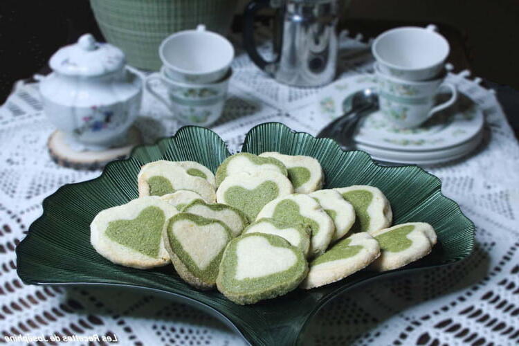 These small heart-shaped shortbread cookies are two-colored and flavored with lemon and matcha tea. You can easily change the flavors and colors. I didn’t want to use food coloring, so I preferred matcha tea, which pairs well with lemon.