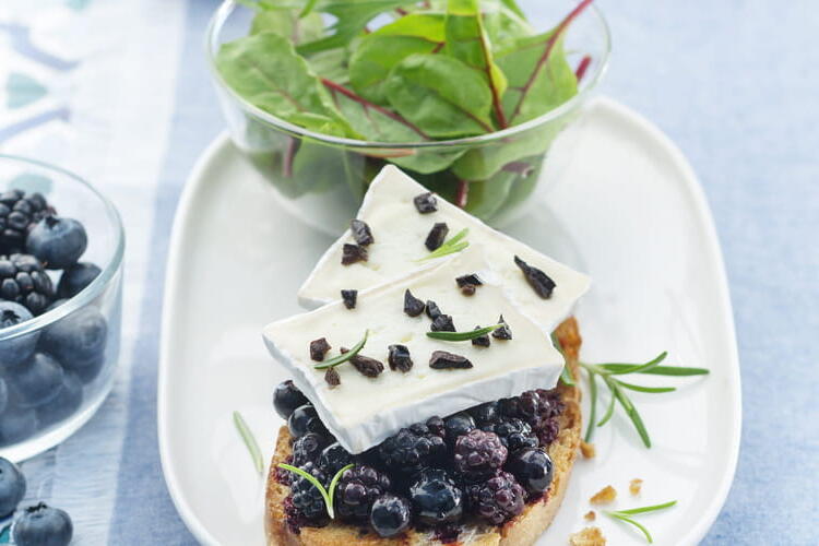 Spread the berries over the warm slices of bread. Place 2 slices of cheese on each slice. Sprinkle with chopped dried blueberries.