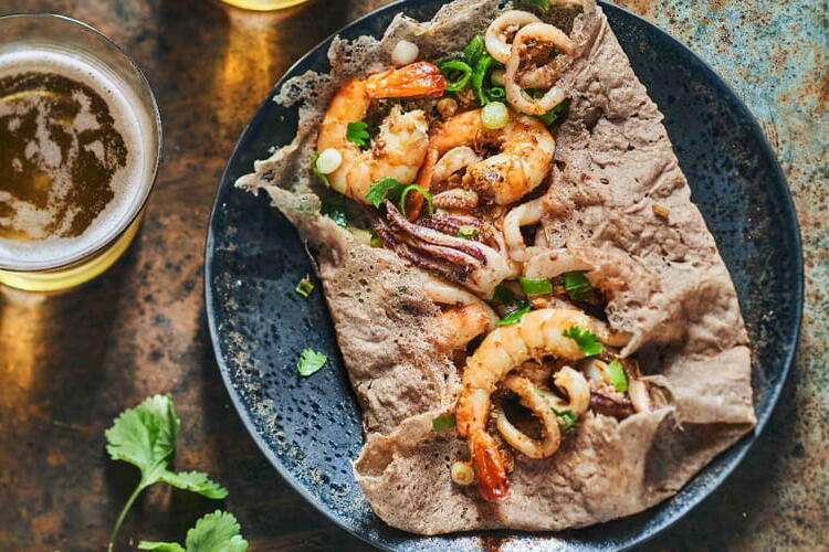 Heat a flatbread in a skillet with a bit of sesame oil. Add the sautéed seafood and warm for a few moments. Prepare the other flatbreads in the same way.