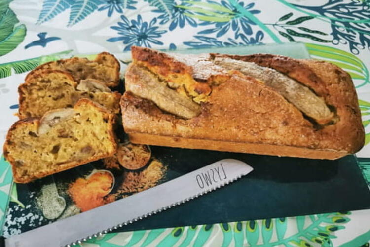In a mixing bowl, put the remaining white sugar and then the whole eggs, and whisk to lighten the mixture. Combine the baking powder with the flour. Sift it over the sugar/egg mixture and whisk until you achieve a smooth and homogeneous batter. Gradually incorporate the salted butter while mixing well. Add the caramelized bananas and then mix.