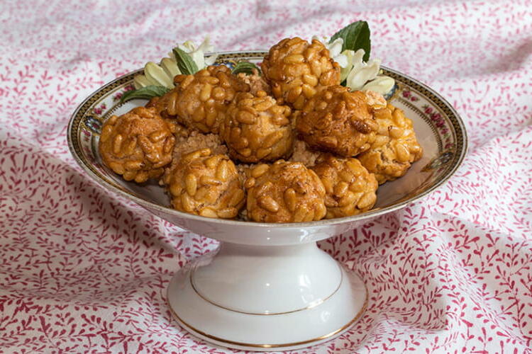 Whip the egg yolks and add the pine nuts. Form small balls the size of a walnut (20g) and roll them in the egg yolk mixture and the pine nuts. With your oiled hands or not, roll them again to incorporate the pine nuts into the dough.