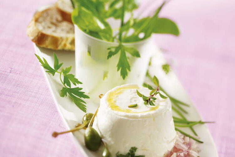 To finish, unmold and place the cheese on a plate. Arrange the capers, shallots, chives, parsley, crushed pepper, and flaky salt around the edge of the plate.