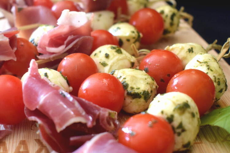 Skew a ball of mozzarella, then a tomato, a ball of mozzarella, a tomato, and finally a piece of ham.