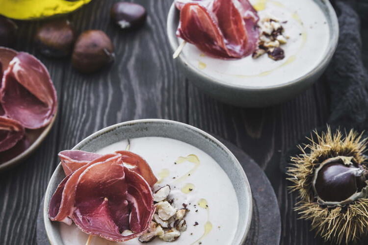 To finish, pour the soup, add some toasted hazelnuts, a drizzle of olive oil, and place the cured meat.