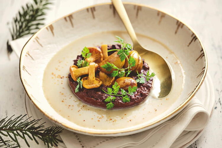 Recipe for Chestnut Velouté with Heavy Cream, Blood Sausage & Chanterelle Pickles