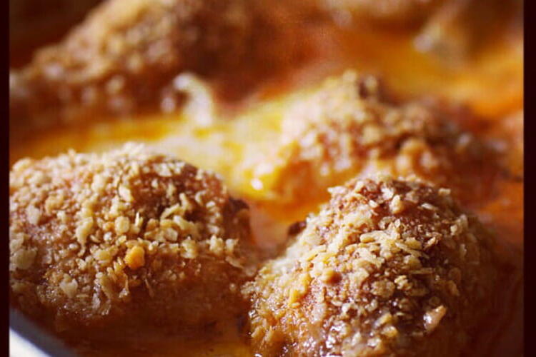 To finish, coat the pieces of chicken with the sauce. Cover with grated cheese (and breadcrumbs - optional), and bake everything until golden.