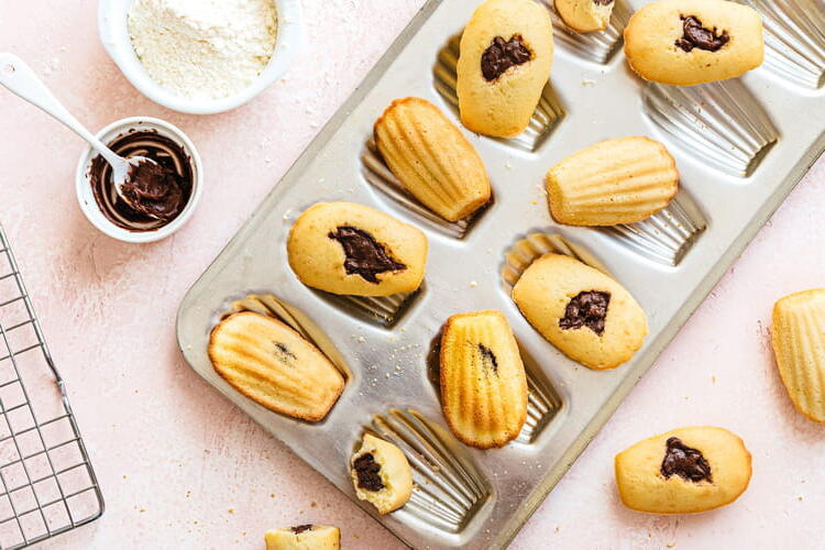 Delight your guests with this delicious recipe for madeleines with a creamy heart of cocoa hazelnut spread. Photo credit: Aurélie Bresset.