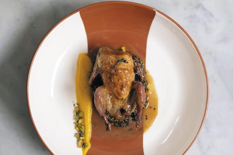 A delicious recipe for confit farm quail, black quinoa, carrot and citrus mousse, and roasted pistachios created by chef Pierre Augé. Credits: Pierre Augé and Alexia Roux.