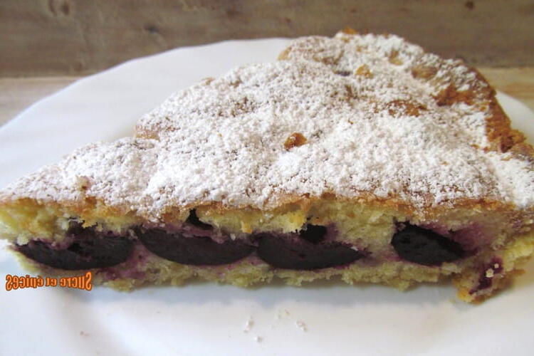 Today, I propose a delicious seasonal tart - a biscuit tart with black cherries. It consists of a shortcrust pastry and black cherries, topped with a soft biscuit dough. An original and delightful combination.