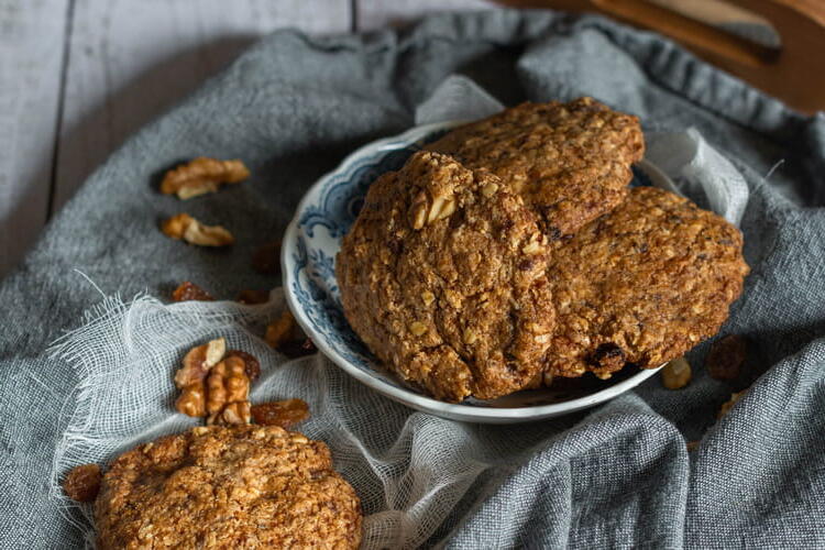 Add the remaining ingredients, finishing with the plant-based milk. Add the crushed walnuts and the raisins.